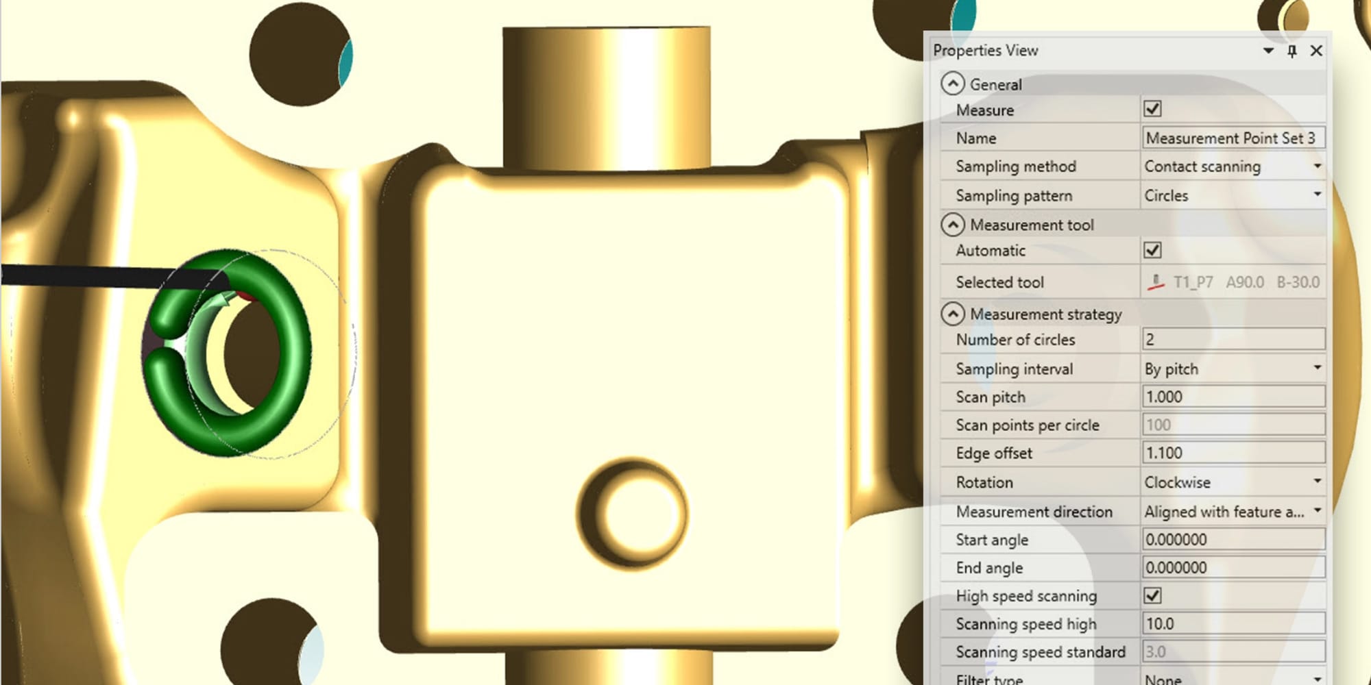 El Editor de reglas de medición puede definir reglas para decidir el método de muestreo (palpador táctil o escaneo/velocidad), el patrón de muestreo, el número de puntos de medición, en función de las características medidas (plano, línea, círculo, etc.) o las características de tolerancia (posición, tamaño, forma, etcétera).